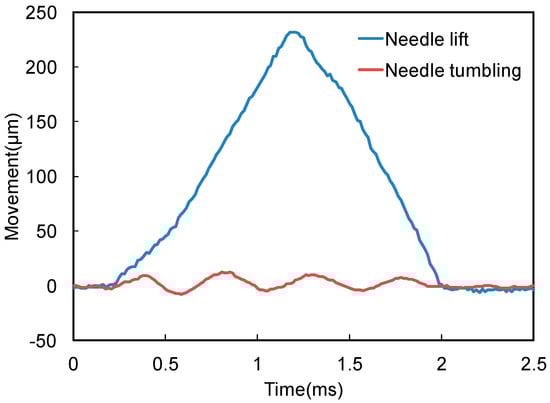 With high speed X-ray measurements, also taken at ANL, the movement of the injector needle is obtained during the injection period. The results are averaged over 10 injections. The needle lift (vertical movement) and the needle tumbling (horizontal movement) are shown in Figure 4 for the case of 25 MPa injection pressure. The needle lift curve almost has a triangle profile. The needle tumbling has a frequency of approximately 2 kHz and an amplitude of about 10 µm in this case.