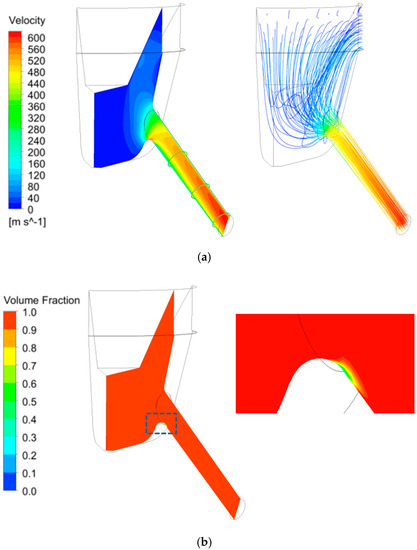 Three-dimensional numerical simulation of the flow inside the nozzle (shown is a 120-degree segment): (a) Velocity amount (left) and streamline (right); (b) Volume fraction of liquid.