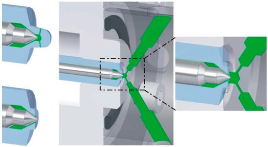 - Jollet, S.; Heilig, A.; Bitner, K.; Niemeyer, D.; Dinkelacker, F. Comparison of experiments and numerical simulations of high pressure transparent injection nozzles. In Proceedings of the 25th ILASS Europe, Chania, Crete, 1–4 September 2013; pp. 1–7. [Google Scholar]