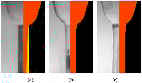 Actual geometries of transparent nozzles: (a) Nozzle A, Basic geometry; (b) Nozzle B, Basic geometry with hydro-erosive grinding (short step); (c) Nozzle C, Basic geometry with hydro-erosive grinding (long step).