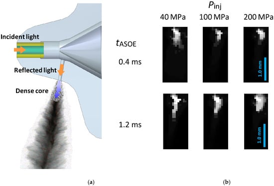 A single hole injector is applied with one nozzle hole with a length of 800 µm, a diameter of 120 µm, a conicity factor of 2 (slightly converging form) and a slightly rounded inlet corner of the nozzle hole with rinlet = 20 µm. Standard diesel fuel is injected for 2000 µs. Measurement examples are shown in Figure 11b for an early stage during the injection with tASOE = 0.4 ms (tASOE = time after start of energizing of the injector solenoid), and for the quasi-steady state of the injection with tASOE = 1.2 ms for three different injection pressures between 40 and 200 MPa.