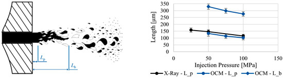 Length scales of the primary breakup with the non-perturbed length (Lp) and the breakup length (intact core length, Lb). Determination of both quantities for different injection pressures for the steady injection state with two methods. Three-hole diesel injector with a nozzle diameter of 115 µm, gas pressure 0.1 MPa. Reproduced with permission from [30], Elsevier, 2019.