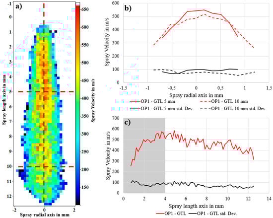 Standard deviations (black lines in Figure 16b,c) are almost constant for the entire spray. It seems that this quantity depends essentially on the correlation window size being constant in this evaluation. It is likely that the application range of the SIV technique can be expanded with more applied adjustments of the correlation window size and higher spatial resolution images.