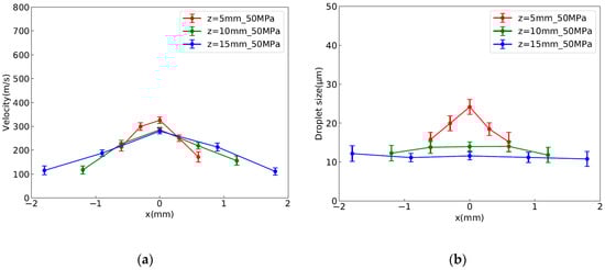 Figure 19a shows the spatial distribution of the droplet velocity at t = 1.2 ms ASOE on three planes of z = 5, 10 and 15 mm from the nozzle exit at 50 MPa injection pressure condition. The velocity data were averaged in a period of 0.1 ms from t = 1.15 to 1.25 ms (middle of the injection period). The velocity was highest at x = 0 mm on z = 5 mm and decreased with increasing the distance from the nozzle exit. The velocities in the spray periphery are lower, as is expected. Figure 19b shows the spatial distribution of the droplet size at the same conditions of Figure 19a. The droplet at the spray center decreased with the distance from the nozzle exit. At the z = 5 mm plane, the droplets show the highest sizes at the spray center, decreasing to the sides. This tendency does not appear on the other measurement planes.