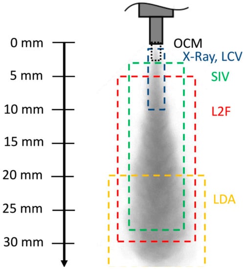 Measurement range for different measurement techniques for high pressure diesel spray injection (OCM = Optical Connectivity Method, X-Ray = X-ray phase contrast imaging and X-ray velocimetry, LCV = Laser Correlation Velocimetry, SIV = Structural Image Velocimetry, L2F = Laser 2-Focus Velocimetry, LDA = Laser Doppler Anemometry).