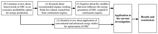 The problems produced by the consumption of fossil fuels have led to the search for alternatives, one example being ORC, which is a recommended option for obtaining electricity using low-quality waste heat [29,30]. A rise in the fuel market and the policy of reducing carbon dioxide emissions have created a massive interest in increasing the thermal efficiency of engines, surpassing techniques already in use. The conversion of waste heat from engines has been considered to be an alternative method for generating energy according to the need that is required [31].