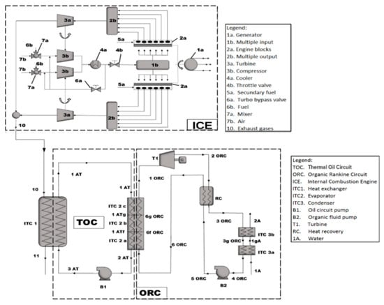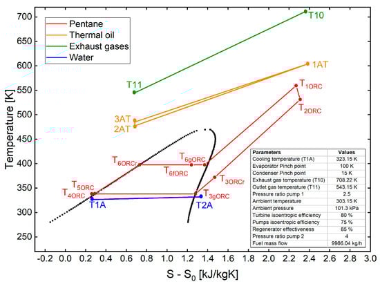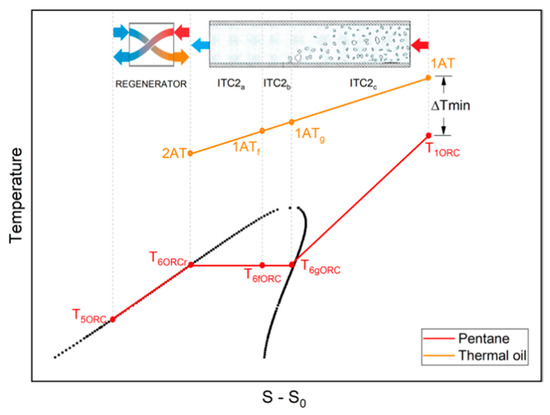 In the same way, through line (10) (see Figure 2) where the exhaust gases circulate towards the WHR system which the heat exchanger (ITC 1) takes advantage of the waste heat, by which, the heat transferred to the secondary circuit (TOC) which consists of a pump (B1) through which it conducts thermal oil from the line (3 AT) to the line (1 AT) to achieve thermal stability of the organic working fluid and ensures that the RORC working fluid does not exceed its maximum temperature. The heat transfer process between the working fluid and the pentane was performed in the evaporator (ITC 2) which was optimized to minimize both the investment costs of the equipment for the system and the irreversibilities of the heat transfer [48]. This equipment was divided into three zones called preheating (ITC 2c), evaporation (ITC 2b), and overheating (ITC 2a) which serves as a thermal source for the ORC with regenerator where the organic fluid described above as the pentane which when driven by (1 ORC) expands in the turbine (T1) before entering a preheating in the recuperator (RC) where the pressure decreases to enter the condenser which consists of two stages, condensation (ITC 3b) and cooling (ITC 3a). Then, at the pump (B2), the fluid is returned to this recovery unit (RC) at the exchanger evaporation pressures (ITC 2), thus completing the RORC cycle. In Figure 3, a T-s diagram of the RORC system is presented.