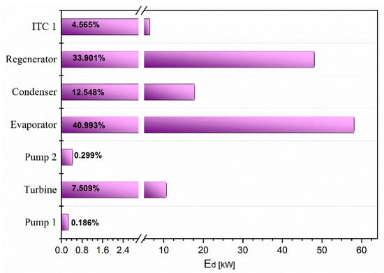 According to the definition of input-output results, the fraction of exergy destroyed in each device was found and is represented in Figure 5. On the one hand, it can be appreciated that greater fractions of exergy are destroyed in the evaporator with a value close to 40.99%, followed by the regenerator with a value of 33.9%, and the condenser with a value of 12.55%. On the other hand, devices that destroy less exergy are the turbine with a value of 7.51%, the exchanger (ITC 1) with a value of 4.56%, and finally Pump 1 and Pump 2 with values of 0.186% and 0.3%, respectively. The components with greater irreversibilities such as the evaporator, regenerator, and condenser are the devices that have greater opportunities for improvement, although the components generate greater amounts of exergy due to interactions with other devices, the nature of the same, or the operating conditions.