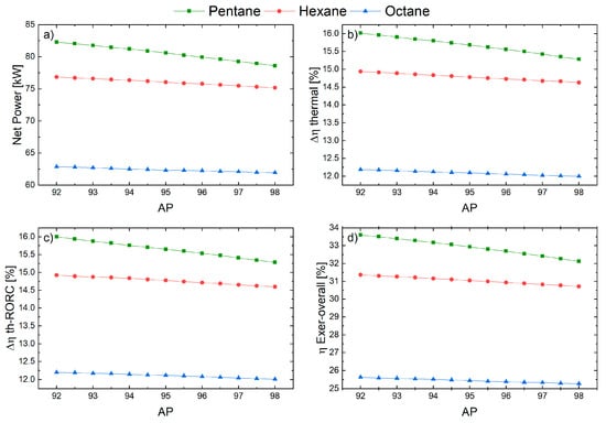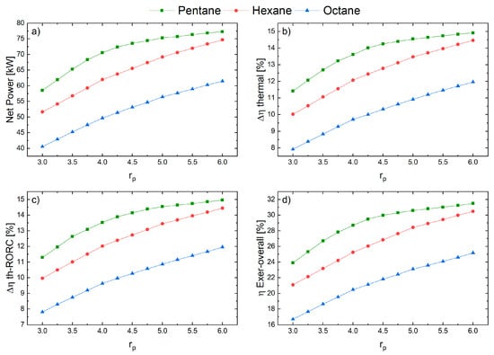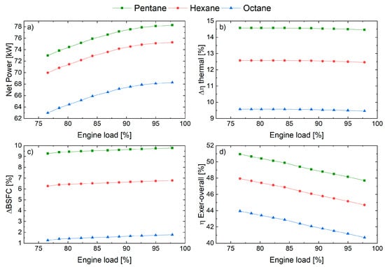 From the simulation results obtained and the thermodynamic properties, some energy and exergy parameters of the WHR system from the engine were calculated, as shown in Table 7. These results show that the WHR system in the base condition result in an increase in thermal efficiency of 1.58% for the natural gas engine, and the RORC has a thermal efficiency of 13.95% and a volumetric energy capacity of 16.28 kJ/m3, which considers the change enthalpy of the system in relation to the density at the exit of the expander.