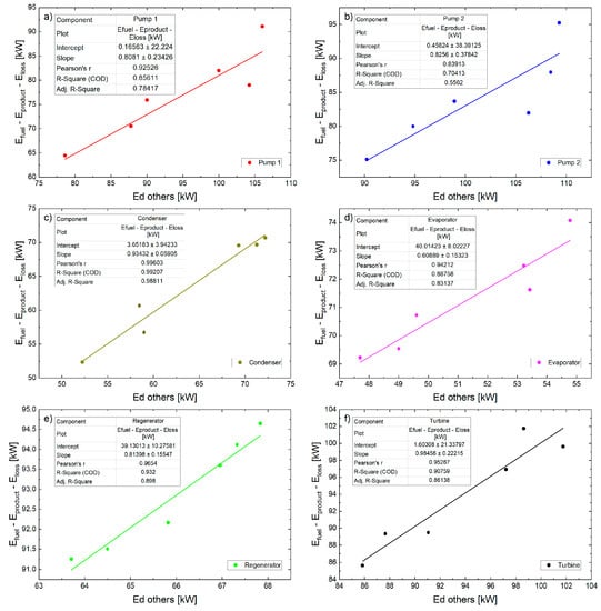 It should be noted that the total exergy destruction per component is calculated from the exergy balance as expressed in Equation (32), where ( represents fuel exergy, the exergy produced, and the exergy of loss.
