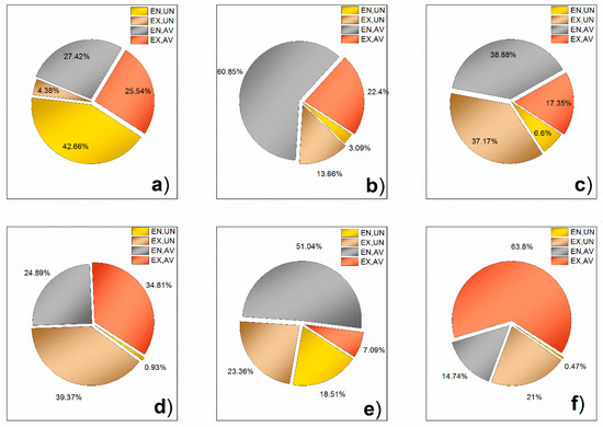 Furthermore, exergy destruction values are split up into four parts, i.e., endogenous, exogenous, avoidable, and unavoidable. The destruction of exergy that is avoidable refers to the possibilities of improvement, and unavoidable exergy destruction represents the limit of improvement of the system or device. Equations (34)–(37) are shown below, describing the previous phenomena, where the division of the avoidable and unavoidable exerges into endogenous and exogenous is made, making it possible to find the avoidable endogenous and exogenous parts to find improvement opportunities for the components of the cycle and the inevitable endogenous and exogenous parts to obtain more knowledge about the process.
