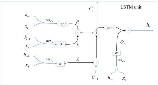- Calculate the three gate units by Equations (11)–(15):where , , , , represent the input gate at time t, forget gate, unit state, output gate, and candidate cell vector unit output, respectively. stands for sigmoid activation function and is expressed by Equation (16):tanh(·) stands for tanh activation function and is expressed by Equation (17):