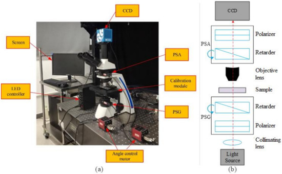 As shown in Figure 1, we set up a polarized Mueller matrix microscope in our laboratory by integrating a polarization state generator (PSG) and a polarization state analyzer (PSA) into a commercial microscope structure. A light-emitting diode (LED) with a center wavelength of 633 nm and bandwidth of 10 nm was used as the light source. A lens was placed in front of the light source to collimate the diverging light. Both the PSG and PSA contain a fixed linear polarizer (GCL-050003, Daheng Optics, Beijing, China) and a rotating quarter-wave plate (WPQ10ME-633, Thorlabs, Newton, NJ, USA). An electric rotary platform (KPRM1E/M, Thorlabs, Newton, NJ, USA) with angular control precision of 1 arc sec was used to control the angular position of the quarter-wave plate. A 14-bit charge-coupled device (CCD) sensor (Retiga R6, QImaging, Tucson, AZ, USA) was used as the light-intensity detector.