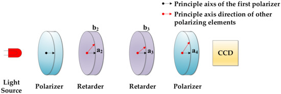 where the symbol pinv indicates pseudoinverse. In the present dual-rotating-retarder configuration, two fixed linear polarizers are placed in front of the light source and the CCD; therefore, the sensitivity of the CCD and the error caused by the partially polarized source are not considered. Thus, the most crucial factor determining is the light intensity stability of the light source, and this random error could be reduced by performing repeated measurements. As the light intensity stability of the light source depends on the specific light source used, we will not describe it further in this paper and will reduce Equation (5) to