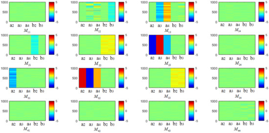 Generally, the Mueller matrix should be analyzed in normalized form, and the influence on the matrix element is therefore ignored. The error sources for the other matrix elements need to be investigated. For the conventional calibration method, as described in Table A1, the Fourier coefficients , , , , , , , , , , , and are combinations of one or more terms from the fourth row or column of the Mueller matrix. However, the system parameters in the polarizing section are calculated in terms of , , , , , , , and , while the system parameter is calculated in terms of . Therefore, the fourth row and column of the Mueller matrix have been regarded as redundant and ignored. This, however, results in information loss and calibration inaccuracy. From Equation (11), it can be observed that the matrix elements in the fourth row and fourth column of the error magnification coefficient matrices of the polarizing section are all zeros. To discuss whether these results were the outcome of some particular default values, we also assigned values other than the default values to the system parameters in the polarizing section. The results show that the calculated error magnification coefficients are stable, and the elements in the fourth row and column are always near zero when the five system parameters simultaneously deviate from the default; this indicates that the errors of the measurement system that propagate to these elements cannot be calibrated using the conventional method. One simulation result for the error transform coefficient matrix is shown in Figure 3, where the horizontal axis of each subfigure corresponds to the five parameters in the polarizing section, the vertical axis corresponds to the simulation times, and different colors correspond to the values of the matrix elements. As the maximum absolute value of any element of the error transform coefficient matrices in Equation (11) is 4, random values in the range of −0.05 to 0.05 were assigned to every system parameter (this range was used because it results in a maximum absolute error of 0.2 before the calibration and is available for the visualization of the results, according to the calculated values determined using Equation (9)). Thus, the error magnification coefficient matrix of the imaging section is supplemented, thereby reflecting the error induced by the objective lens, and the calculated results are presented by Equation (12):