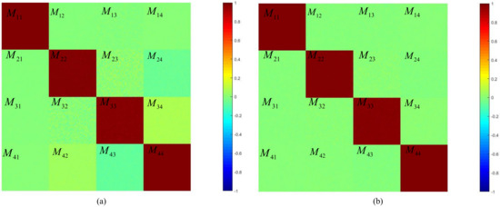 Measured Mueller matrix elements of air, presented on a colormap, (a) after calibrating the polarizing section and (b) after calibrating both the polarizing and imaging sections. The , , , and elements are closer to zero in (b) as compared to (a), indicating that the imaging section mainly influences the calibration results of these four elements.