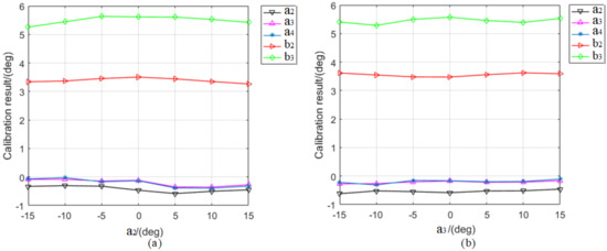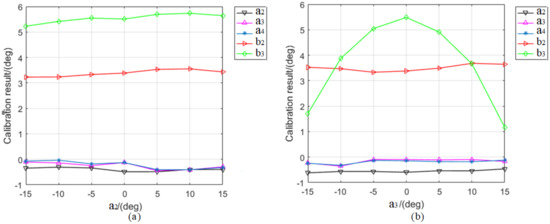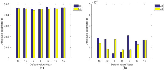 Figure 5 and Figure 6 show the calibration results for the air sample when and deviate from their default values; Figure 5a and Figure 6a correspond to , while Figure 5b and Figure 6b correspond to . The vertical axis shows the difference between the calibration and assumed values. The experimental results clearly show that the calibration result of determined using the conventional calibration method is unstable (Figure 5b), but the calibration result with the proposed method (Figure 6b) fluctuates only slightly, and the standard deviations of for the conventional and proposed methods are 1.6772 and 0.0971, respectively. In addition, the calibration results for all the other parameters in the polarizing section have good consistency, indicating that the proposed method is highly robust.