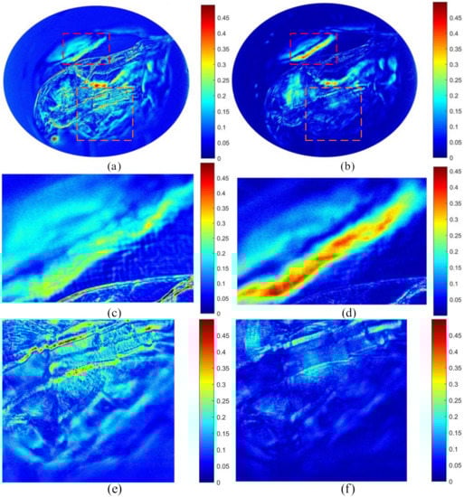 The Daphnia occupies the middle area, so the pixels at the edge correspond to the air. The values of the pixels at the edge in Figure 10a are larger than those in Figure 10b; on the other hand, the pixels corresponding to the Daphnia also have large errors, and the birefringence features at these pixels are smaller than the errors caused by the imaging section, thereby leading to an erroneous judgment of the birefringence of the sample. For instance, the values in the red dotted box approximately range from 0.15 to 0.23 in Figure 10c and from 0.29 to 0.47 in Figure 10d, and the values of the orange dotted box area approximately range from 0.15 to 0.36 in Figure 10e but from 0.03 to 0.21 in Figure 10f. The comparison results shown in Figure 10 are similar to those obtained for the air and quarter-wave plates, i.e., when the birefringence of the sample is weak, the calculated value of is larger than its theoretical value, but is smaller than its theoretical value for the sample with strong birefringence. Then, the polarization features of Daphnia were recovered, as shown in Figure 10b; this is unlike the results presented in Figure 10a, where the experimental results were severely distorted by the birefringence of the imaging section. Thus, the proposed method possesses considerable advantages in terms of improving the estimation accuracy of the birefringence caused by the internal structures of the Daphnia and retaining more details of the hierarchical structure of the tissue.