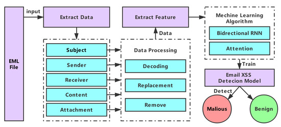 This paper proposes a Webmail XSS detection model based on deep learning. The basic framework is shown in Figure 2. At first, it collects the EML format less dedicated to the email. Secondly, the data for each key field will be extracted. The extracted data includes the sender, receiver, subject, content, and attachment. After that, the system performs feature extraction, which mainly provides input for the deep learning algorithm. In the end, the model trained by deep learning can be used to detect Webmail’s XSS email.