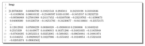 First, we formed a corpus of processed benign and malicious samples. Then, we used Word2Vec to train in the corpus and get the word vector for each word. Referring to Jingchi Zhang’s research on XSS detection [25], we set the word vector dimension of Word2Vec to 200. The word vector of the “img” is shown in Figure 3.