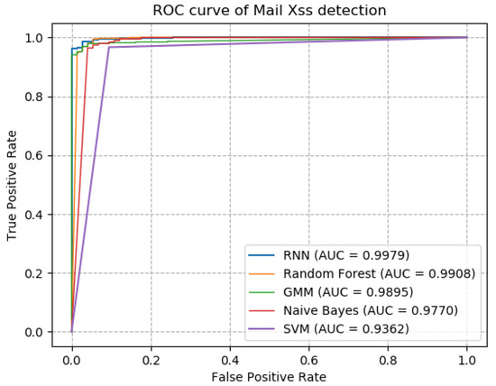 From Figure 6, we saw that the AUC value of the Bidirectional-RNN reaches 0.9979, which is much higher than other traditional machine learning algorithms. Only the random forest who is a multi-classifier can be similar to AUC value to the Bidirectional-RNN algorithm. It showed that the integrated learning algorithm and the deep learning algorithm were better than the traditional machine learning algorithm when training the email XSS dataset. This was because the deep learning algorithm and the random forest algorithm were more efficient in working under a high-dimensional dataset with higher accuracy. A more detailed assessment is shown in Table 8.
