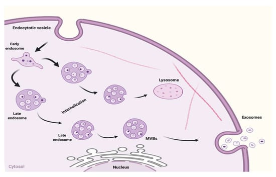 Limited MVB is subjected to internal budding leading to late endosome formation, which in turn generates exosomes in a constitutive way. The formation of intraluminal vesicles (ILVs) within MVBs from late endosomal membranes is caused by invagination []. During invagination, some proteins are incorporated into the membrane and the cytosolic components are engulfed and enclosed in ILVs. The release of ILVs is indicated in the extracellular space after fusion with the exosome’s plasma membrane. Degradation of the components occurs in the lysosomes. Canonical exosomes are biconcave in shape produced by artificial drying, but they appeared spherical when viewed using transmission electron microscopy [].