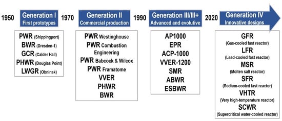 The second classification (thermal reactors) is the most used [1,2,3] and allows defining the following generations of nuclear reactors (Figure 1): Generation I: prototypes built between 1957 and 1963; Generation II: commercial production, built from the mid-1960s onward; Generation III: advanced reactors—safer and with greater generation capacity, built since the early nineties; Generation III+: nuclear reactors with structural safeguards and/or passive safety features, designed from the 21st century; and finally Generation IV: the highly efficient reactors of the future, with advanced safety features and generating small amount of spent nuclear fuel.