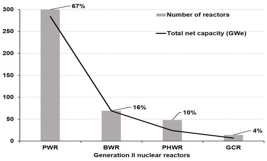 The 447 nuclear reactors operating in the world as of January 2020 are distributed as follows: (i) PWR: 300 operating reactors, representing 67% of the operating nuclear reactors and an electric power generation capacity of 284 GWe; (ii) BWR: 69 operating units, representing 16% of the total and an electrical power generation capacity of 69 GWe; (iii) PHWR: 48 operating units, representing 10% of the total and a capacity of 24 GWe; (iv) other designs: the remaining 7% of the operating nuclear reactors in the world are capable of generating 17 GWe, among which are different designs such as GCR and LWGR (Figure 3). It should be noted that these data correspond to January 2020 and that they may vary from the current ones depending on (i) the start-up of a reactor that was previously under construction or (ii) if there has been a permanent shutdown of a reactor that was in operation.