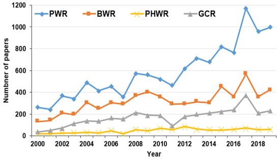 From a simple consultation in SCOPUS on the number of articles that include, in the title, abstract, or keywords, the names of Generation II designs (PWR, BWR, PHWR, and GCR), Figure 4 was obtained. Thus, a total of 22,457 papers in the SCOPUS database include the denomination of the Generation II designs (data collected in April 2020). Among this criterion, 11,762 (around 52%) of the total published papers include “PWR” or “pressurized water reactor”, so this design gets the highest number of papers among Generation II nuclear reactors. On the other hand, approximately one half (48%) of the published research papers are linked with the rest of Generation II designs. In this group, 6341 papers containing “BWR or “boiling water reactor” (approximately 28%); 958 papers containing “PHWR” or “pressurized heavy water reactor” (around 4%); and 3396 papers containing “GCR” or “gas-cooled reactor” (around 15%) in the title, abstract or keywords. It should be emphasized here that the GCR design exhibits a higher scientific interest than expected, since its OP is only 4% in the world (Figure 3). This may be due to the GCR nuclear power plants are mainly concentrated in the United Kingdom—where this nuclear reactor design was developed. In this country, approximately 93% of the operational reactors are GCR (14 GCR nuclear power plants) and 71% of the total permanent shutdown reactors are also GCR. Therefore, nuclear scientific research in this country is specialized and focused on GCR design.