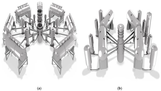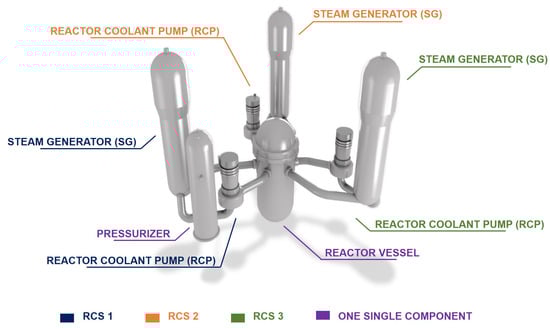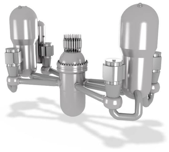 Combustion Engineering (CE) built 15 nuclear power plants in the United States: Arkansas Nuclear One-2, Calvert Cliffs 1 and 2, Millstone-2, Palisades, Palo Verde 1-2 and 3, St. Lucie 1 and 2, and Waterford-3, Maine Yankee, San Onofre 2 and 3. This company’s PWR design (called CE80) [10], is made up of 2-loops connected to the reactor vessel, located in the central part of the system. Unlike other variants, in each primary circuit there are two cold legs—connecting the steam generator outlet with the vessel—and in each of these legs a reactor coolant pump is installed (Figure 9). This first major modification of the traditional PWR design was due to the second fundamental modification in this variant, the increase in dimensions of the steam generator. This increase in the size of the steam generator results in an increase in the volume of the coolant, and therefore results in an improved design response to accident conditions with reduced inventory.
