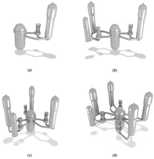 Westinghouse PWR designs: (a) 1-loop; (b) 2-loop; (c) 3-loop; and (d) 4-loop.