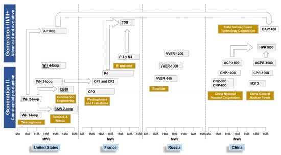 If we analyze the different relationships throughout the evolution of American, French, Russian, and Chinese PWR designs (Figure 11), we observe the existence of different technical influences throughout history, which have given rise to a large number of variety of designs with different related technical aspects. The beginnings of the PWR design are found in the different Westinghouse versions, in which both the number of loops and the size of the main components (reactor vessel, steam generator, reactor coolant pump and fuel assemblies) increased as new reactors were redesigned. These changes mainly favored an increase in electricity generation capacity.