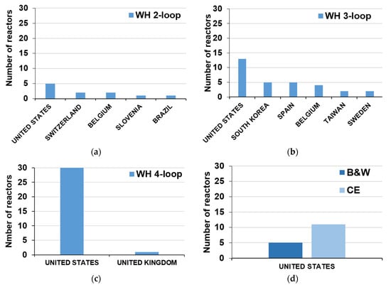 Taking as a reference the 300 PWR nuclear reactors operating around the world in early 2020 [6], it is observed that the countries where this design has been mostly implemented are the United States, France, China, and Russia (Table 4). Besides, these countries are also the ones with the most operational nuclear reactors in their territory. According to Table 4, the PWR design is fully implemented in the cases of France and China. However, in the United States and Russia, there is greater diversification of technologies, since the PWR design accounts for approximately 60% of the operating nuclear reactors. This may be because in France and China they adapted nuclear technology later than in the United States or Russia, and consequently learned from the experience of predecessor countries in choosing their reactor design. Other countries outside the scope of this global PWR review, but with a high number of operating reactors in their territory, are Korea and Japan. On one hand, among the 24 operating reactors in Korea, 21 have PWR technology. On the other hand, Japan has a total of 33 operating reactors, and among them, 16 are PWR.