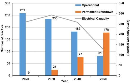 Even considering new PWR nuclear power plants that could be projected in the coming years, this technology will suffer a drastic reduction in the coming years. The possible increase in the useful life to 60 years of the current operational PWRs would mean that this design maintains its global impact for other designs during the period 2020–2030, in which only 24 reactors would go into shutdown and the power generation capacity would increase as new Generation III designs—with higher generating capacity—now under construction start operating. According to Figure 19, starting in 2040, the PWR nuclear power plants will notably reduce their electrical capacity. This situation is likely to influence decisions about future investment and operating costs [71], as well as prospects for the decommissioning and management of high-level radioactive waste at current nuclear power plants [72,73,74,75,76,77]. Lastly, if no advances are made in R&D of new designs or in the use of the actual nuclear power plants in cogeneration systems for the production of hydrogen [78,79], in 2050 this technology will decrease its generation capacity to 50%, keeping 127 GWe and the number of operating rectors at 70%. It is worth noting that these data are underestimated and, hence, this situation will likely occur earlier.