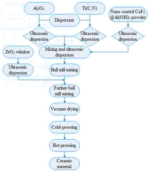 The Al2O3 and MgO powders, Ti(C,N) powders were added to the absolute ethyl alcohol with polyethylene glycol, respectively. Then, the dispersions were ultrasonically dispersed and mechanically stirred for 20–30 min. Mixing the Al2O3 dispersion, the Ti(C,N) dispersion and the dispersion containing the nano coated CaF2@Al(OH)3 powder, the mixed solution was ultrasonically dispersed and mechanically stirred for 10–30 min, thereafter the dispersion was poured into ball mill tank for ball milling. After 44 h of ball milling, the ZrO2 whisker was added to the ball mill tank. The prepared multiphase suspension was dried in the vacuum drying oven (DZF-6050, Shanghai, China), and then the multiphase suspension was sieved to obtain composite powder. The composite powder was put into a graphite sleeve for cold-pressing. After the hot pressing in the vacuum hot-pressing sinter (ZR1050, Jinan, China), the Al2O3/Ti(C,N)/ZrO2/CaF2@Al(OH)3 ceramic material was fabricated. The preparation process influenced the microstructure and further influenced properties of the material [,]. The parameters selected in this experiment were as follows: the sintering temperature was set to 1650 °C under 30 MPa, the soaking time was selected as 20 min and the heating rate of the preparation progress was set to 20 °C/min. Figure 1 shows the process flow chart of the composite ceramic material preparation.