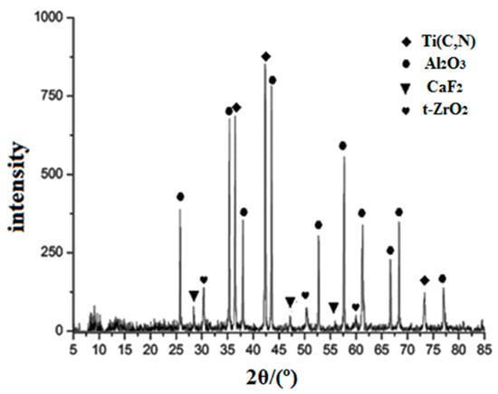 The XRD (XRD is the abbreviation of X-Ray Diffraction) diffraction analysis of the ceramic material with 6 vol% ZrO2 whisker and 10 vol% nano coated CaF2@Al(OH)3 powder is shown in Figure 2. In the ceramic material, the phase analysis indicates that the predominant phases for the composites are Ti(C,N) and Al2O3. Before the experiment, the ZrO2 whisker exists in monoclinic phase. From Figure 2, it can be seen that ZrO2 exists mainly in the form of t-ZrO2 in the ceramic material. This indicates that the phase transition took place during the sintering. The ZrO2 whisker underwent a phase change. The introduction of nano coated powder does not have a significant influence on it, which provides the fundamental condition for the phase transition toughening. The presence of the characteristic peak of CaF2 is clearly observed. In this paper, the addition of sintering aid MgO is 0.5 vol%. The characteristic peak of MgO is not observed, because the addition amount of MgO is too small. The chemical composition of the various components constituting the composite ceramic has a good chemical compatibility, and an obvious chemical reaction does not take place.