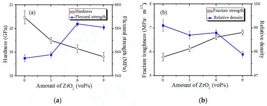 Mechanical properties of Al2O3/Ti(C,N) with ZrO2 whisker. (a) Hardness and Flexural strength, (b) Fracture toughness and Relative density.