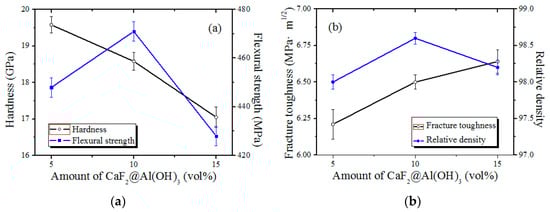 The results of adding 5 vol%, 10 vol% and 15 vol% nano coated CaF2@Al(OH)3 powder on the mechanical properties of the Al2O3/Ti(C,N) ceramic material are displayed in Figure 6. From Figure 6a, with the increasing addition of CaF2@Al(OH)3, the hardness is prone to decrease. The main reason is the low mechanical properties of the CaF2. The increase in lubricant addition inevitably leads to a decrease in the hardness and other properties. The flexural strength of the ceramic material first increases and afterward decreases. When the addition of nano coated CaF2@Al(OH)3 powder is 10 vol%, the flexural strength is up to 471 MPa. From Figure 6b, with the increasing addition of nano coated CaF2@Al(OH)3 powder, the fracture toughness is increased from the initial 6.50 MPa·m1/2 to 6.60 MPa·m1/2. The main reason may be that the presence of massive nano coated CaF2@Al(OH)3 powder enhances the material’s fracture toughness. The relative density of the ceramic material shows a trend of increasing first and afterward decreasing. When the addition of the CaF2@Al(OH)3 powder is 10 vol%, excellent comprehensive mechanical properties are obtained.