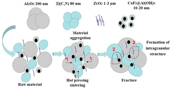 In the sintering course of the Al2O3/Ti(C,N)/ZrO2/CaF2@Al(OH)3 ceramic material, with the development of temperature and soaking time, the crystal grains grow gradually. The matrix powders accommodated by ball milling will have the situation that small powders are gradually absorbed by large powders and the number of powders is continuously reduced. The growth of crystal grain rests with the motion of boundaries of particles. The boundaries in the matrix tend to migrate to the center, as indicated by mark 1 in Figure 7. Due to the shell material (Al2O3) of the lubricant being the same as the matrix powders (Al2O3) of the ceramic material, the nano powders are dispersed into the interior of the matrix material during the sintering of the ceramic material. With the intergranular nanostructure of the nano CaF2 powders dispersed inside, the surface coating design avoids powder agglomeration growth.
