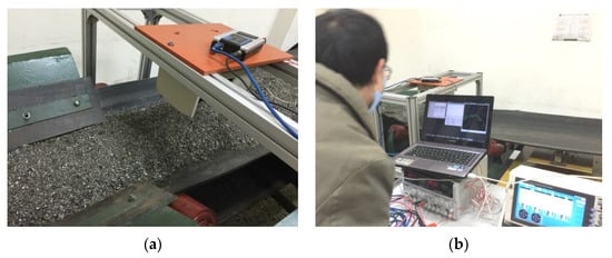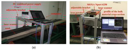 An experimental facility for bulk material distribution measurement is designed and constructed, as shown in Figure 2. It is designed to experimentally measure bulk material cross-sections in real-time and can be used to study the mechanical properties of a belt under actual material distribution conditions. The facility conforms to DIN 22101 (1982) “Type and Basic Parameters of Belt conveyors”, which can simulate a real process of continuous transportation of bulk material in laboratory conditions. It consists of a variable frequency controller which can adjust the belt speeds varying from 0.2 to 4 m/s. Due to the limited size of the laboratory space, the longitudinal length, horizontal width, and height of the facility are designed as 3500 mm, 760 mm, and 400 mm, respectively. It is a trough-type belt conveyor with three idlers, and the idler roll set spacing is 700 mm. The height of the facility is adjustable from 400 mm to 1338 mm to change the inclination angle of the belt conveyor system. The parameters of the experimental facility are listed in Table 1. A (7000 × 500 × 11 mm) rubber canvas belt is used to test the non-shrinkage of bulk materials. The electrical control components of the facility include a squirrel cage asynchronous motor, power switch box and frequency converter. The parameters of the frequency converter can be modified to realize open-loop control functions (starting, positive or negative rotating, etc.) or closed-loop control functions.