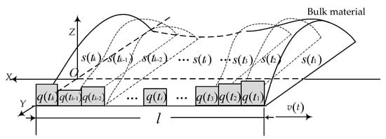 In Figure 4, the belt moves in the negative direction of the x-axis. s(t) = {s(t1), s(t2)…, s(tk)} is the collection of cross-sectional areas of material flow calculated in unit time T between time (t-1)T and time tT. v(t) = { v(t1), v(t2)…, v(tk)} is the collection of belt speed in unit time T between time (t-1)T and time tT. Therefore, the bulk material distribution qG(t) (kg/s) in unit time T between time (t-1)T and time tT could be represented as