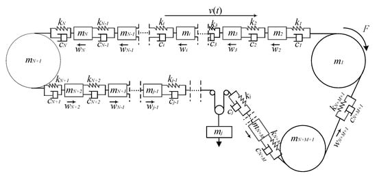 The belt conveyor system is discretized into N + M + 1 elements. The first driver motor is numbered as the first element. Assuming that the conveyor belt does not slip on the roller, the equivalent mass of the drive motor at the straight direction can be put in the mass of the first element. Similarly, the equivalent mass of the second driver motor can be put in the mass of the N + M + 1 element.