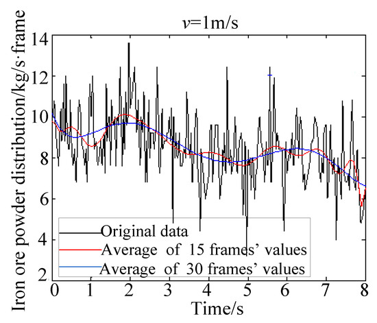 The original data curve in Figure 9 shows that the transient iron ore powder distribution fluctuates violently. Due to the high resolution of the laser scanner, the non-uniform bulk material distribution model can better reflect the real state of bulk material transportation. However, the violently fluctuation of original data may affect the measurement of real logistics morphology. Therefore, a mean filter is adopted to smooth the original data. Through experimentation, the average of every 30 frames is smoother than every 15 frames. For verification, 9 sets of measurements had been designed to obtain non-uniform iron ore powder distribution. Every 8 measurement values from 10 measurements corresponding to the same level standard flow rate of iron ore power were recorded after removing the maximum and minimum values. Table 2 shows the repeated measurements corresponding to standard volumes at three speeds of the belt and their repeatability. The average error between the laser measurement and the artificial measurement is within 3%. The repeatability and correlation (RPT) are more than 98%. In addition, the variation coefficient (CV) of the measurement value at different speeds is less than 2%, which means that the belt speed has a small influence on the measurement results. In the subsequent dynamic simulation test, the non-uniform bulk material distributions on belt, which are used for establishing the discrete model of the belt conveyor system, can be obtained from this measurement system.
