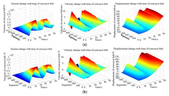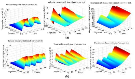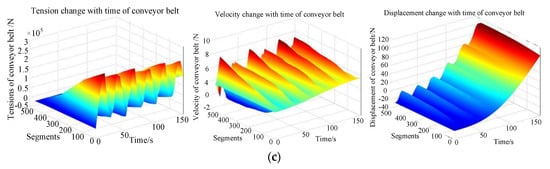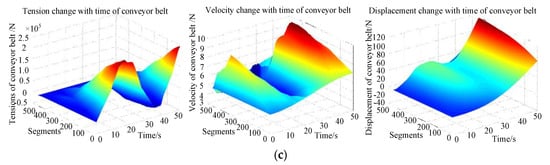 Starting under Harrison sinusoidal acceleration, the starting time T is 50 s, the maximum band speed under stable operations is 3.75 m/s, and the simulation time is 50 s. Then, the dynamic characteristic surface of the belt conveyor under empty-load, light-load and over-load is shown in Figure 10.