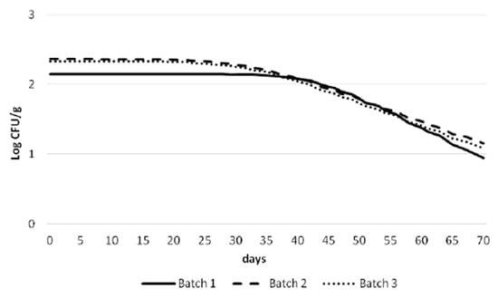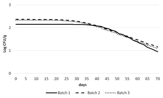 As shown in Table 3, the latency phase (Lag) of the three fitted curves ranges from a minimum value of 32 days (780 h) to a maximum value of 42 days (1032 h) for batch 2 and 1, respectively. The values registered in this study are remarkably higher than the value obtained through the growth prediction performed with the Combase Predictor tool [] that was of 0.72 days (17.3 h, data not shown). As reported in the literature, the duration of the latency phase is characterized by inherent variability and by partially defined physiological and molecular processes [], however, recent findings suggest that changes in the lag-time in order to develop tolerance can be considered the first change made by bacteria in response to stressor factors []. The optimization and elongation of Lag may therefore represent a strategy adopted by bacterial communities to tolerate environmental stress [,,], that may correspond, in this study, to the hurdles present in the food matrix.