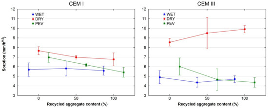 - The conditions of hardening influenced the sorption of concrete, being definitely better for wet curing and with protection against drying (water evaporation) and in both cases better for CEM III than CEM I as a binder.