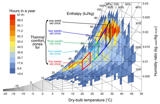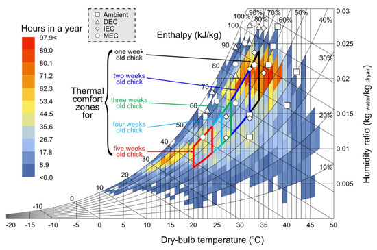 Temperature and humidity control are necessary for every human and non-human’s thermal comfort [4]. Additionally, the poultry birds also require an optimum temperature and relative humidity conditions for healthy growth [21]. Hence, seasonal variation in weather demands the need for AC. Figure 1 shows thermoneutral zones for poultry birds and represents the physical effect of heat stress on the poultry (broiler) birds [22]. Three different temperature zones are mentioned as thermoneutral, upper, and lower critical temperature zones. Optimum physiological growth in the birds increases with the optimum range of temperature and humidity inside the poultry house. Compared to the human body, the poultry birds lack sweat glands to dissipate body heat in a heat-stressed environment [21]. The birds transfer excess heat from their body into the environment by panting (i.e., heavy breathing) once the thermoneutral zone is crossed [21]. During the panting process, the birds transfer additional moisture into the environment, which leads to their suffocating conditions. Once the environment reaches a maximum heat point (i.e., dry-bulb temperature ≥ 47 °C [23]), the birds expire due to extreme stress heat. Figure 2 shows psychrometric representation of the required optimum temperature and relative humidity conditions for the birds (i.e., broilers) of varying age, and hourly climatic distribution of Multan. One-day-old chicks need relatively more temperature as compared to the elder chickens, as dictated by local practice of using heaters for one week. The optimum temperature slides down from 34 to 32 °C, 32 to 28 °C, 28 to 26 °C, 26 to 24 °C, and 24 to 20 °C for one, two, three, four, and five week-old chickens, respectively [24,25]. At the same time, the relative humidity (RH) is maintained at 50–70% throughout the growth period [24,25]. In the poultry house, heat load is contributed by metabolism and respiration of the broiler, structure of the building (through convection), air change through doors, and sunlight through windows [26]. To satisfy the thermal comfort needs for poultry birds, a comprehensive AC system is needed to be installed in the poultry house, which has the potential to achieve the required heat loads. In this study, the working principle of different EC systems is explained and their respective performance for poultry air-conditioning is investigated including the effect of temperature, relative humidity, and velocity on the growth of poultry birds.