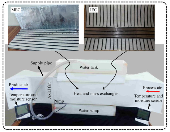 Three kinds of lab-scale experimental EC systems were developed as shown in Figure 3. There was a similar housing assembly used for different heat mass exchangers (i.e., IEC and MEC channels) for experimentation. The direct (DEC), indirect (IEC), and M-cycle (MEC) evaporative cooling systems were operated for different conditions and the experimental data of temperature and relative humidity for the climatic conditions of Multan (Pakistan) was collected. Performance of the systems was evaluated in terms of the temperature gradient (i.e., difference between ambient and supply air temperature) and relative humidity (RH) level (of the ambient and supply air) to investigate the thermal comfort of poultry birds. In Figure 3, pictorial representations of the developed experimental systems along with MEC and IEC channels are presented. It consists of a fan, moisture sensor, temperature sensor, velocity sensor, and water storage tank. Additionally, experiments of the DEC system with cellulose cooling pads (or more commonly known as honeycomb pads) was used for this experiment instead of aspen wood fiber contained in a net (local name “khas”). The detailed scientific concept and thermodynamic fundamentals of these developed EC systems are described in the coming subheadings.