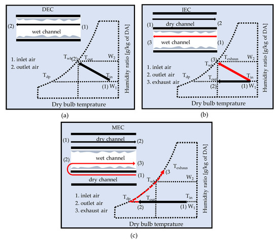 The schematic and psychrometric representations of the EC systems for (a) DEC, (b) IEC, and (c) MEC configurations.