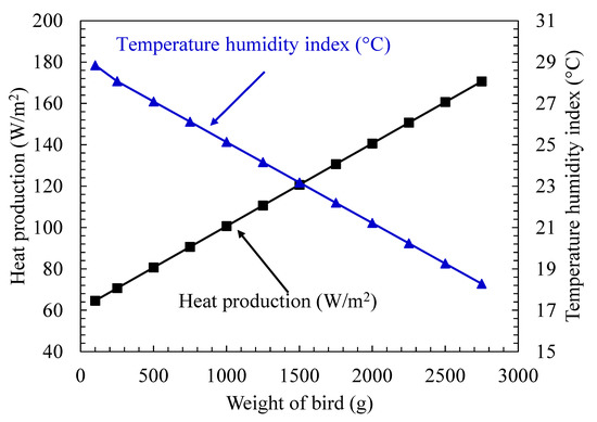 Figure 8 represents the relationship of heat production (HP) and temperature-humidity index (THI) with live weight of poultry birds. HP of poultry birds increases in linear function with respect to LW. In the early stage of poultry growth, higher THI is tolerated while justifying the earlier statement about use of heaters for one-week old chicks. Heat production is at peak when poultry birds achieve harvest mass. Poultry birds ready for harvest generate the highest heat (i.e., 171 W/m2) against THI of 18.2 °C at 2.75-kg live weight.